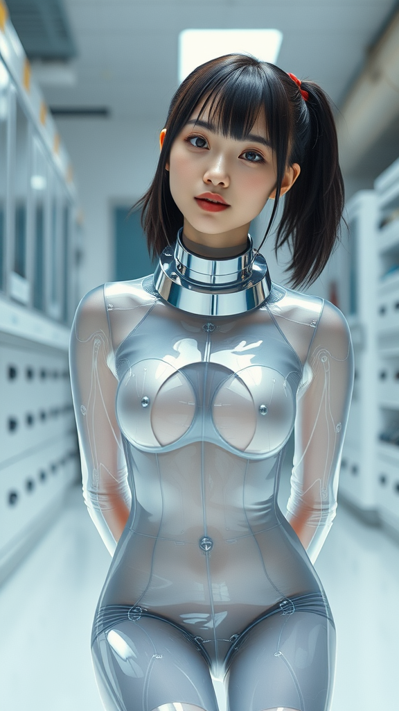 A high-resolution live-action masterpiece featuring a very detailed full-body shot of a Japanese woman with delicate facial features, kneeling with her hands behind her back in a laboratory setting. She has a cute, slightly smiling face with beautiful irises and shiny, slightly sweaty skin. Her shiny black ponytail contrasts with a transparent polymer suit adorned with a subtle pearlescent sheen that perfectly matches her skin. Visible delicate electronic circuits run through her body, adding a futuristic touch. A thick metal collar encircles her neck as she tilts her head slightly, creating an inquisitive expression. The suit's design harmonizes with her form, and her eyes glisten with curiosity amidst the lab's advanced technology.