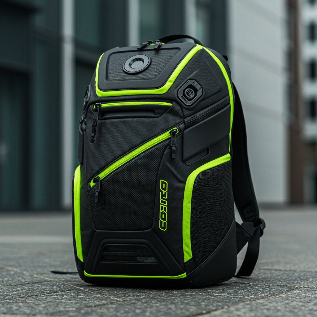 A high-resolution photograph captures a sleek black and vibrant neon yellow urban sports backpack, designed with a dynamic and athletic flair. The composition conveys motion and energy, highlighting the backpack's intricate texture and detailed design. The interplay of octane-inspired elements accentuates its aggressive and bold character, set against a modern urban backdrop, bringing out the vivid contrast and 4K clarity of the scene.