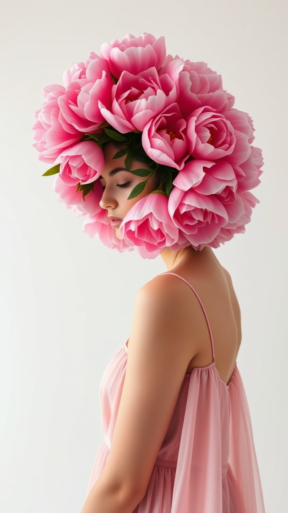 A high-resolution photograph of a woman elegantly posed in a minimalist white room, wearing a flowing dress. Her head is artistically adorned and completely covered with a vibrant arrangement of pink peonies, creating a striking visual impact. The room is devoid of any distractions, highlighting the contrast between the soft textures of the flowers and the simplicity of the space. The atmosphere conveys a sense of serene beauty and artistic abstraction, emphasizing the contrast between nature and minimalism.