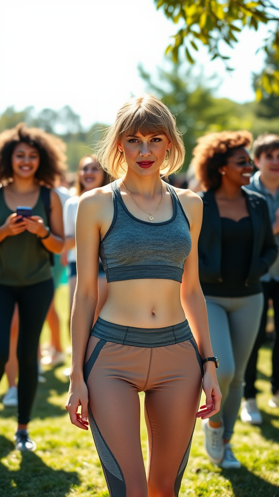 A high-resolution photograph of Taylor Swift in a stylish workout outfit, standing in a sunlit park. The scene features realistic shadows, captured using a Canon EOS R6 with a 135mm lens, settings include 1/1250s shutter speed, f/2.8 aperture, and ISO 400. Background includes a mix of individuals engaging in joyful activities, with smiling people characterized by diverse hairstyles, including curly hair and bangs, while maintaining a casual vibe under a clear sky.