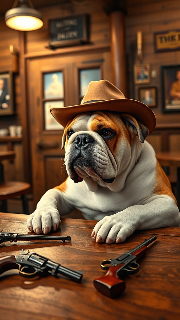 A high-resolution portrait capturing an English bulldog intently playing poker in an old western saloon. The scene is vibrant, featuring the bulldog wearing a small cowboy hat, focusing on its poker hand with a mischievous glint in its eyes. Surrounding saloon details include wooden tables, a swinging half door, and vintage revolvers casually placed nearby. The ambiance is steeped in nostalgia, with soft warm lighting enhancing the rich, rustic textures of the setting. The image is shot with a Fujifilm XT3, rendering every wrinkle in the bulldog's expressive face and every grain in the wooden surfaces in stunning 8k ultra-high definition.