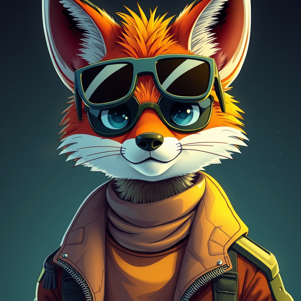 A high-resolution portrait of a stylized cartoon fox donning sleek sunglasses, rendered in vray tracing for a hyper-realistic neonpunk aesthetic. The fox is intricately dressed in detailed costumes, showcasing a blend of futuristic and urban design. With a cold and detached atmosphere, the scene captures a sharp, ultra-detailed focus reminiscent of a Konica Big Mini photograph. The image projects an 8k resolution clarity, combining elements of collaboration and artistic flair.