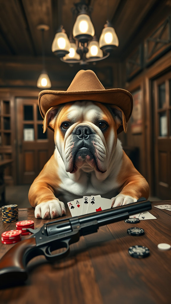 A high-resolution portrait of an English bulldog engrossed in a game of poker, set in a classic western saloon with wooden floors and swinging doors, the dog is wearing a small, worn cowboy hat tilted jauntily to one side, its eyes focused and expression serious as it holds a pair of aces. Around the table, poker chips and cards spread, adding a touch of tension to the scene. Dimly lit lamps hang overhead, casting a warm glow over the rustic setting, while an antique revolver rests casually on the table within the frame, hinting at the wild west atmosphere. Captured in stunning detail with a Fujifilm XT3, 8k uhd, the image features remarkable depth and clarity, showcasing the textures of the dog's fur and the weathered wood of the saloon.