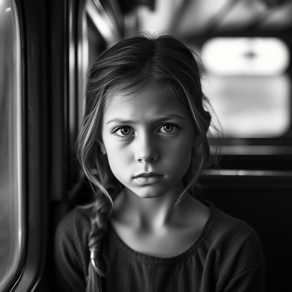 A high-resolution, realistic black and white photograph captures a young girl in an antiquated train cabin, her melancholic gaze meeting the camera. The scene is portrayed with a cinematic angle, highlighting the intricate details of her expression. Soft, dynamic light streams in from the window behind her, casting gentle shadows and adding depth to the image. The background blurs into an elegant bokeh, subtly showcasing the aged textures of the cabin, contrasting with the youthful yet poignant presence of the girl.