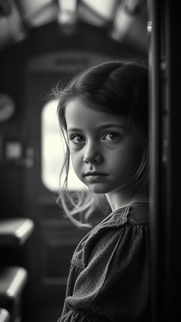 A high-resolution, realistic black and white photograph captures a young girl in an antique train cabin, her eyes meeting the camera with a poignant, thoughtful expression. The scene is shot with a professional touch, using a cinematic angle that highlights the dynamic backlighting, casting soft shadows and illuminating the rich textures of the cabin. The background softly blurs into a dreamy bokeh, gently drawing attention to the girl's delicate features and the nostalgic atmosphere enveloping her.