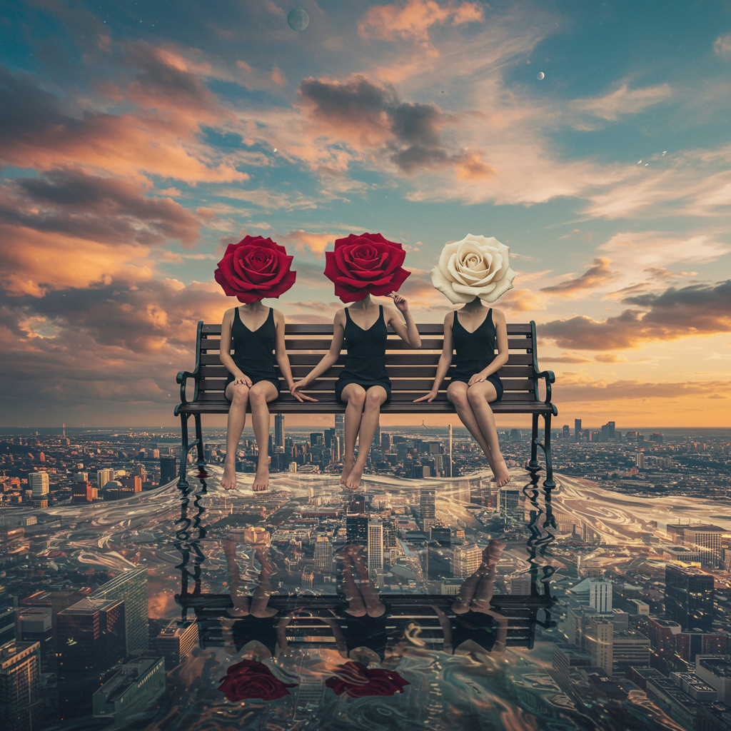 A high-resolution surrealistic portrait of a levitating bench above a fluid, bustling metropolitan cityscape. Seated on the bench are three women with roses for heads, one with a crimson rose and the other two with ivory roses. The liquid-like city beneath them shimmers with reflective surfaces, distorted skyscrapers, and swirling lights, adding a dreamlike quality. The sky is an otherworldly mix of swirling clouds and vibrant colors, casting an ethereal glow on the scene.