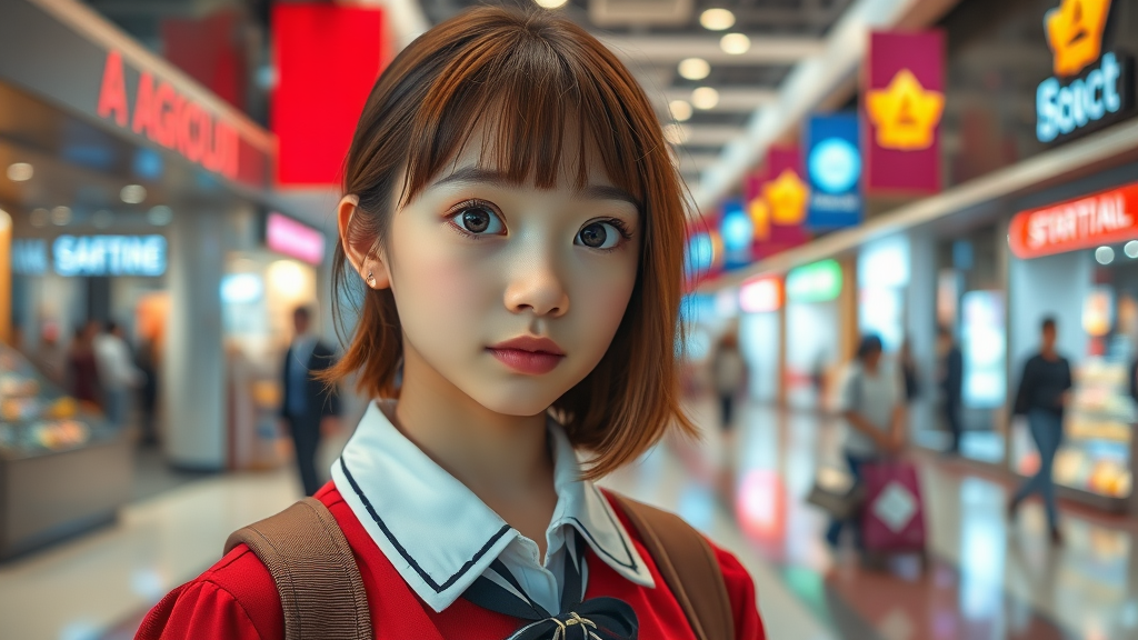 A high school girl with medium brown hair stands in a lively shopping mall, her detailed high school uniform perfectly pressed. Her face and eyes are highly detailed, capturing an expression of curiosity and wonder. The mall's interior is vivid and bustling, with soft reflections on glossy floors and dynamic volumetric lighting enhancing the scene. Soft shadows and a subtle depth of field bring focus to her, with colors that pop vividly against the backdrop. The overall image is professional and sharp, showcasing an impressive quality and sharp focus on detail.