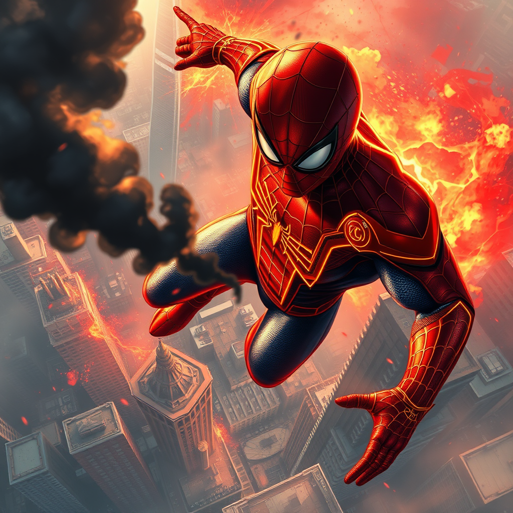 A high vantage shot captures skyscrapers nestled below as Spiderman engages in a fierce battle, his rage evident and every muscle taut with energy. His body is intricately adorned with luminous golden runes, exuding a powerful red and blue aura. In an epic and dynamic action pose, he is encased in a meticulous anime style with full body GALAXY armor that shimmers brilliantly. In the midst of the chaos, jet black smoke plumes spiral around him. Created in the style of Prokoko, the scene is a symphony of bold, expressive brushstrokes and vivid colors, while the china ink effect adds depth and intensity. The scene is amplified by a CarnageStyle modifier with an evocative blood red color palette and an intensity level of 1.6. The cinematic lighting enhances the dynamic angle, pushing extreme details to the forefront of this visually stunning moment.
