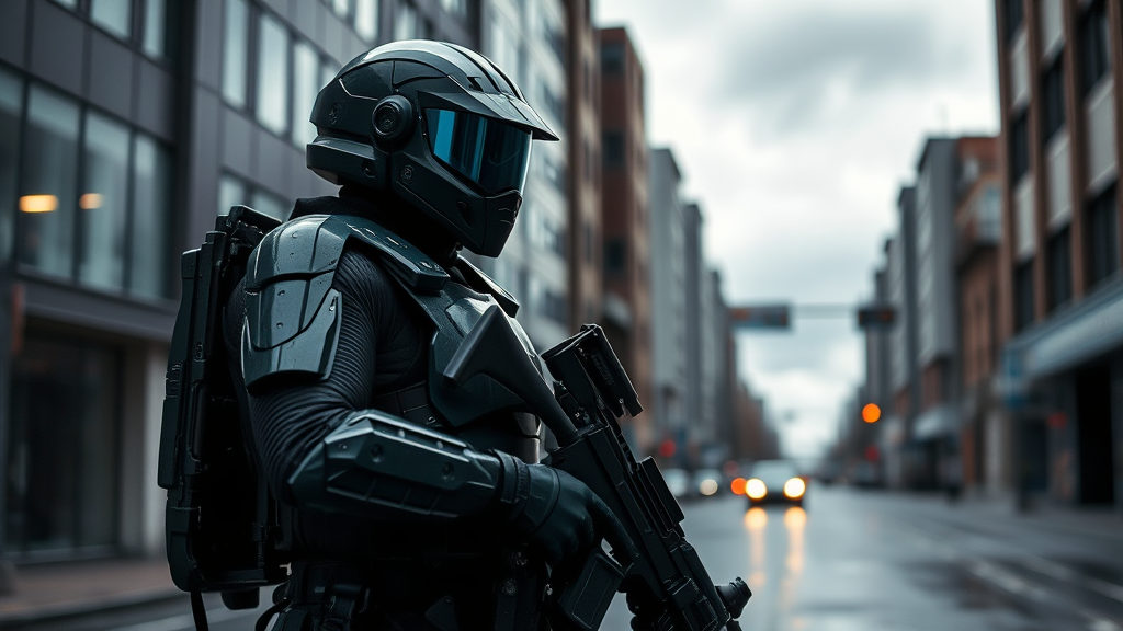 A highly advanced futuristic soldier clad in sophisticated dark forest green armor stands poised on an urban street under an overcast sky, the seamless design showcasing cutting-edge weaponry and an elaborately crafted helmet. This setting allows for intricate reflection mapping that accentuates the armor's meticulous details under dramatic, cinematic lighting. The hyperrealistic and photorealistic visual comes to life in an 8k resolution, simulating the immersive effects of the latest game engine technology. The scene captures the tension and depth of a climactic moment, blending realism with the heightened detail of science fiction.