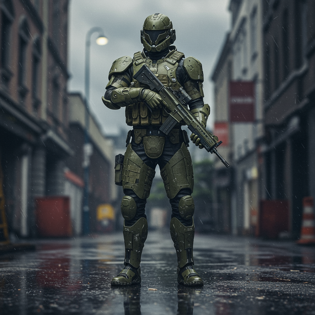 A highly advanced futuristic soldier equipped with cutting-edge armor and weaponry, featuring a sleek dark army green design. The intricate detailing of the armor showcases a blend of technology and craftsmanship, with dramatic lighting emphasizing its complex structure. The soldier stands on a wet, dystopian street, the overcast skies casting a moody ambiance. Reflections from the environment highlight the soldier's helmet and gear, each element designed with hyperrealistic precision. The scene captures a cinematic and photorealistic quality, rendered in stunning 8k resolution, reminiscent of an Unreal Engine masterpiece.