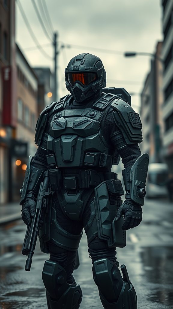 A highly advanced futuristic warrior clad in intricately detailed and advanced armor stands vigilantly on a damp urban street beneath an overcast sky. The armor, a sleek and dark army green, reflects the muted light, showcasing its hyperrealistic design and complex texture. Equipped with state-of-the-art weaponry and a sophisticated helmet, the soldier exudes an air of cinematic grandeur. The scene is rendered with photorealism, capturing the intricate elements and dramatic lighting that accentuate the soldier’s formidable presence. The high-definition quality, akin to an 8k resolution, brings out the soldier's every detail, amplified by reflection mapping effects that highlight the urban environment.