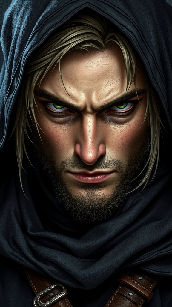 A highly detailed 16k masterpiece portrait of a male rogue character, showcasing an award-winning image with symmetrical features. Featuring a full body reference sheet for a fantasy setting, this RPG-inspired creation draws from Dungeons and Dragons themes. The rogue is depicted with an air of mystery and cunning, adorned in stealthy attire with intricate textures and nuanced shadow play. His piercing gaze and confident stance suggest a seasoned adventurer, embodying the essence of a fantasy world full of intrigue and danger.