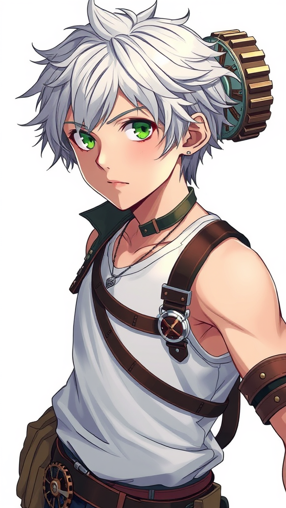 A highly detailed 2D game art illustration featuring a 16-year-old young man. He has light gray hair and striking green eyes, wearing a white tank top underneath intricately designed steampunk attire. The character is depicted in a dynamic pose that captures a sense of movement and energy. His clothing features gears, leather straps, and metal embellishments typical of steampunk fashion. The visual style strongly emphasizes anime influences, showcasing exaggerated expressions and precise line work. The artwork is rendered in high definition with a crisp white background, drawing inspiration from the design aesthetics of artists such as Hideo Minaba, Yuya Nagai, Ryoji Ohara, Ryota Murayama, and Hitomi Yoshimura, reminiscent of the Granblue Fantasy universe. The composition is in a 2:3 aspect ratio, demonstrating exceptional attention to detail and artistry.