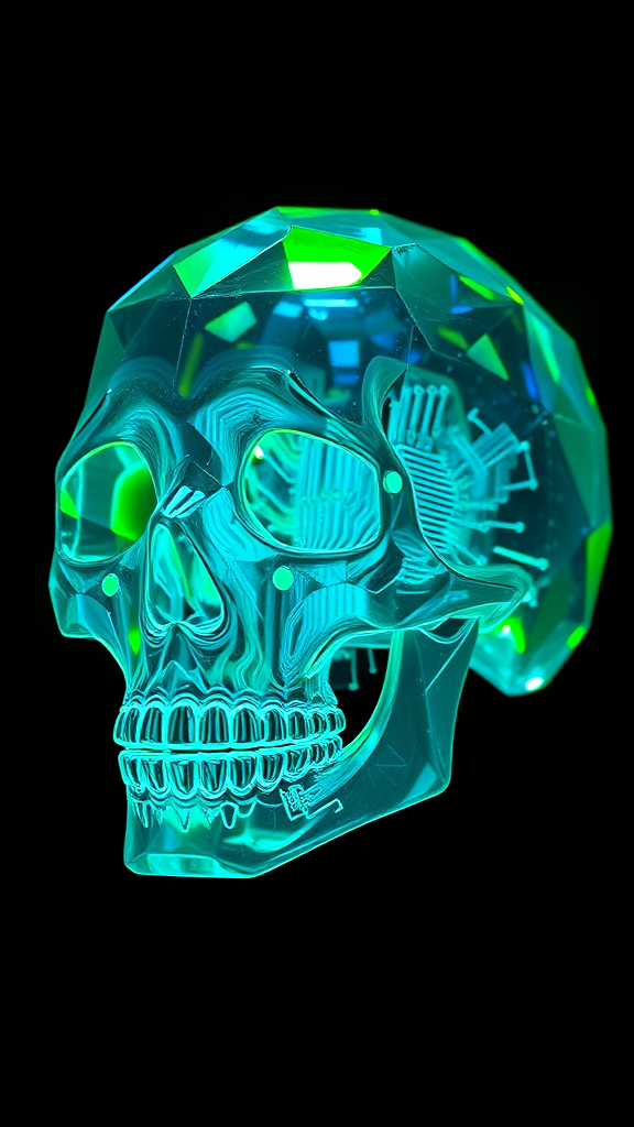 A highly detailed 3D image of a transparent crystal skull, with facets that catch and refract light, creating an ethereal glow as vibrant green and blue luminescence permeates its structure. The skull's interior subtly reveals intricate circuitry patterns illuminated by the fluctuating colors, adding a futuristic twist. Suspended in a void-like black background, the scene evokes a sense of awe and mystery, as though the skull is an ancient alien artifact. The use of Octane rendering elevates the image with hyper-realistic reflections and depth, accentuating its otherworldly sci-fi allure.