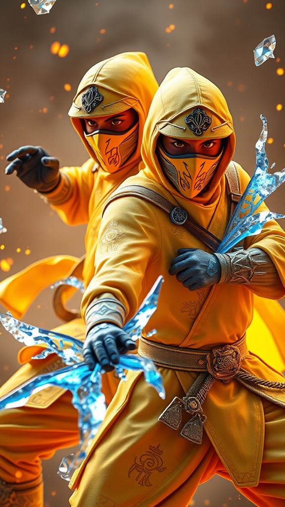 A highly detailed 3D render featuring a yellow ninja and a blue ninja, embodying the elements of fire and ice. The scene is rich with textures of gold and diamond, creating a dynamic contrast between the warmly glowing yellow and the cool, shimmering blue. The ninjas are posed in an action-packed stance, highlighting their elemental powers, with intricate patterns adorning their attire that reflect their respective themes. The lighting emphasizes the ultra-realistic details of their costumes and the surrounding environment, creating a vivid and immersive atmosphere. The aspect ratio of the scene is set to 2:3, enhancing the vertical dynamics of the composition.