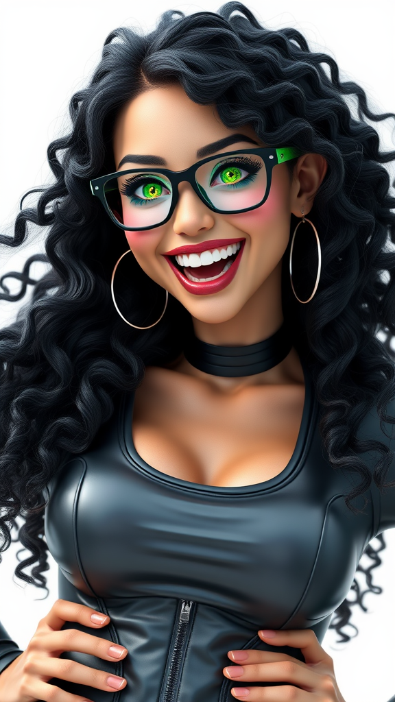 A highly detailed 3D render of a cybergirl with an exuberant laugh, hands confidently on her hips. Her sharp green eyes shine behind stylish, futuristic glasses. She has long, flowing black curly hair that adds dynamic movement to the scene. Crafted in a sleek futuristic style, the image boasts ultra-realistic textures and bright front lighting, enhancing every intricate detail of her expressive face. Styled in a state-of-the-art outfit that complements her tech-savvy persona, the composition is set against a transparent background, highlighting the artistry and depth of the 8k ultra-detailed render.