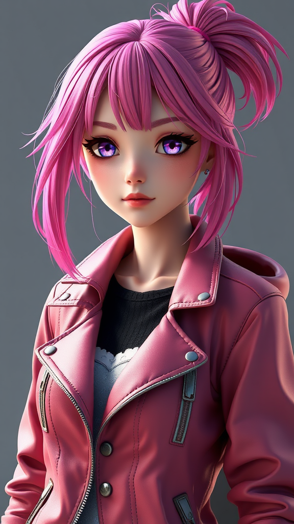 A highly detailed 3D render of a female character featuring vibrant pink hair, dressed in a stylish jacket, blending realistic and anime-inspired elements. The realistic anime 3D style captures photorealistic details, showcasing the character as a compelling lead in an intriguing narrative. With a balance of lifelike features and anime flair, this concept presents a unique, visually striking portrayal of a modern heroine.