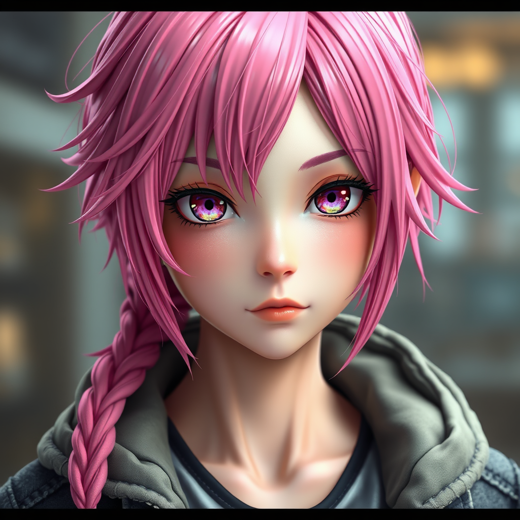 A highly detailed 3D render of a female character with vibrant pink hair, wearing a stylish jacket. The character embodies a realistic anime-inspired style, with photorealistic features and intricate detailing. The design captures the essence of a female lead character, blending realism with stylized elements typical of anime. Her expressive eyes and lifelike textures emphasize a balance between realism and fantasy, creating an engaging and visually striking character concept in an anime-styled 3D rendition.