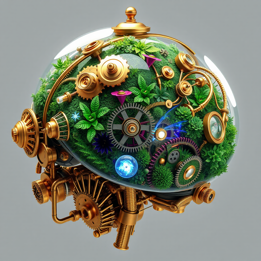 A highly detailed 3D render of a sci-fi baroque concept design showcasing an anatomically correct brain device integrated with a lush terrarium. The piece exhibits steampunk aesthetics, featuring intricate gears and cogs intertwined with delicate botanical elements. This hyper-realistic design combines scientific precision and artistic flair, with its golden accents and transparent glass domes. The terrarium's vibrant ecosystem thrives amidst the intricate metal framework, with tiny steam pipes and glowing filaments weaving through the structure. The overall composition is a marvel of both organic beauty and mechanical ingenuity, creating a photorealistic masterpiece that maintains the essence of its original inspiration while introducing subtle creative enhancements.