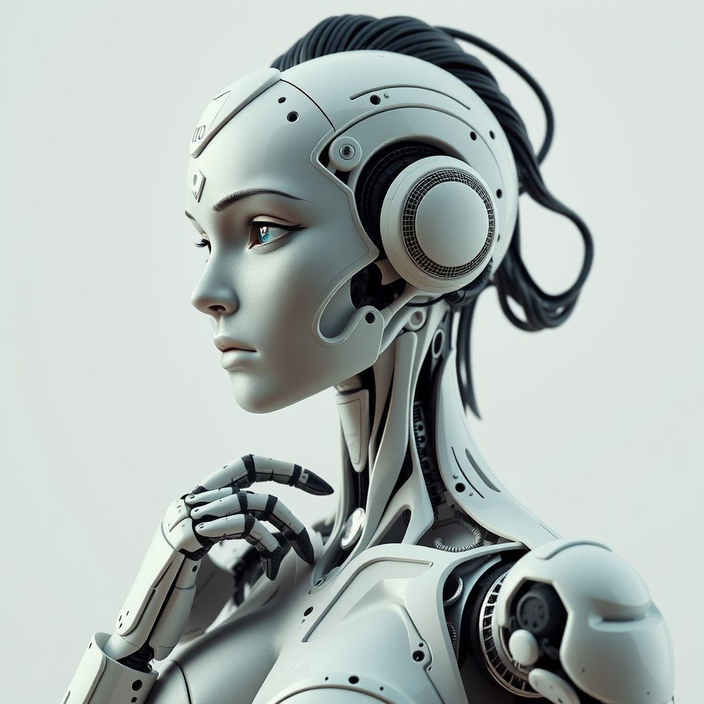 A highly detailed 3D render of a stunning porcelain profile woman robot with intricate features and a cowboy shot angle, showcasing ultra-realistic textures and big breasts. This 8k, UHD, HDR artwork captures a figure with an elongated neck and subtly altered details for a unique look, featuring elements like duplicated facial aspects, cross-eyed gaze, and slight hand mutations for an artistic edge. The focus is on impeccable realism, free of any low-resolution artifacts, out-of-frame distractions, blurriness, or digital imperfections like watermarks, logos, letters, or split images, ensuring a seamless and captivating visual experience.
