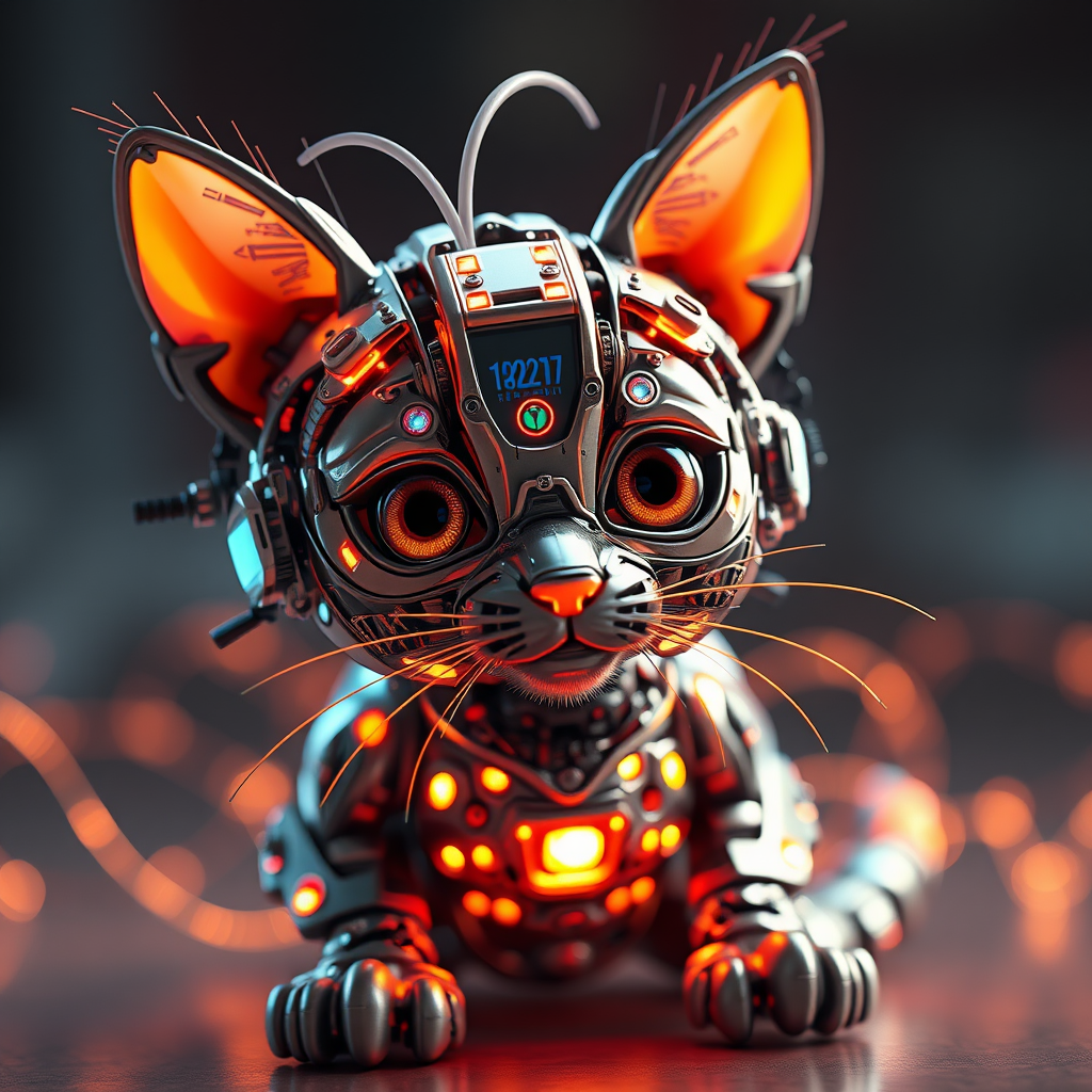A highly detailed 3D render of an adorable cyborg kitten composed of intricate metal structures and luminous circuitry, capturing vibrant elements and a dazzling display of glowing wires. Using Unreal Engine and Octane Render to achieve cinematic quality, the image showcases flawless detail akin to award-winning photography, with expertly crafted composition in vivid 8k resolution. The scene is enhanced with dynamic lighting, a subtle rim light to accentuate the kitten's form, and a touch of creative flair to bring this meticulously designed creature to life.