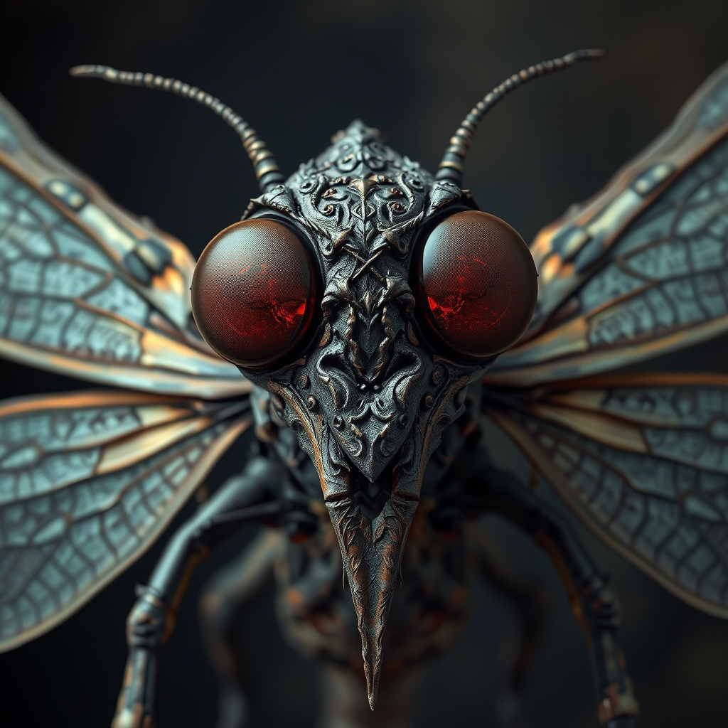 A highly detailed, 3D rendered macro photograph of a mythical humanoid dragonfly, its ancient, grotesque form accentuated by a weathered, dark exterior with elaborate, timeworn patterns and textures. Its enormous, luminous eyes are fully open, showcasing an intricate, mesmerizing internal structure reminiscent of stained glass. The dragonfly's expansive wings are unfurled, highlighting a delicate, lace-like network of veins. Set against a dim, softly blurred background, this enigmatic creature captures attention as the primary focus of the image, offering a glimpse into a fantastical world.