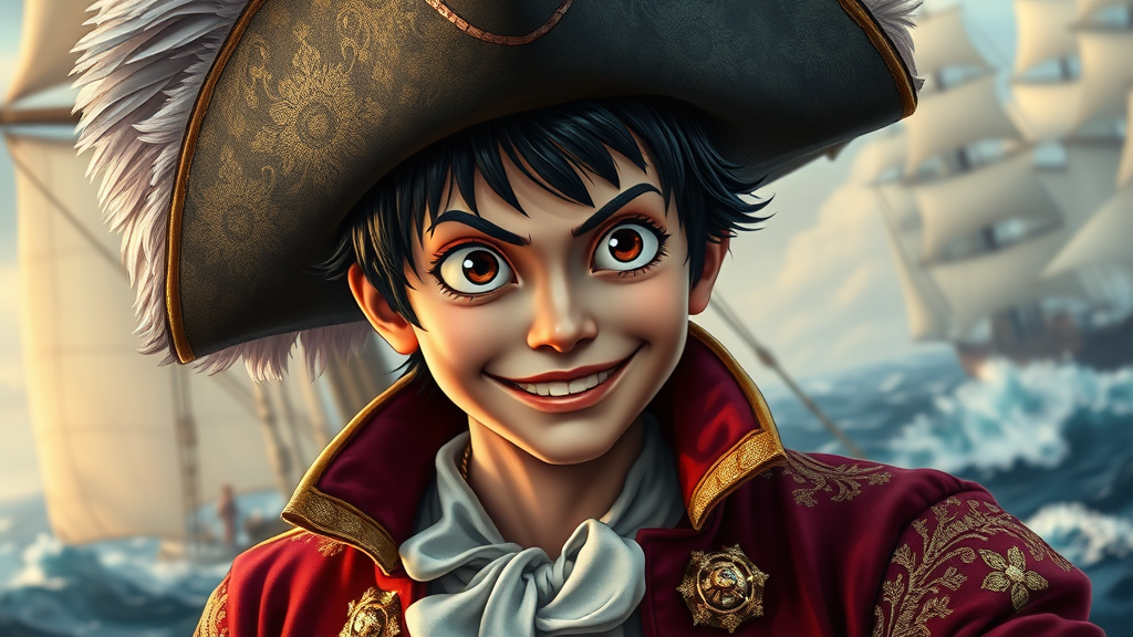 A highly detailed 4k portrait of a fantastical adventurer with a whimsical and youthful charm, reminiscent of Monkey D. Luffy but dressed in elaborate baroque-style attire. He sports a flamboyant tricorn hat adorned with opulent feathers and wears an intricately patterned velvet jacket with gold embroidery. The backdrop features a grandiose, maritime scene with billowing sails and a turbulent sea, reflecting his adventurous spirit. His eyes are bright and full of determination, with a mischievous grin that suggests a love for adventure and freedom, capturing the essence of a swashbuckling hero in a classical setting.