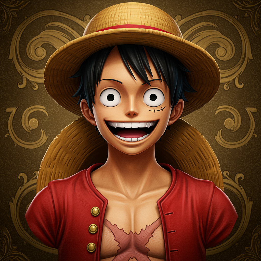 A highly detailed 4k portrait of Monkey D. Luffy, captured in a baroque style with a touch of creative flair. His exuberant personality is reflected in his expressive eyes and wide grin, set against a backdrop of intricate swirling patterns reminiscent of the baroque era. Luffy's iconic straw hat and red vest are adorned with ornate gold embellishments, adding an air of regality and depth. The play of light and shadow highlights his youthful features and adventurous spirit, resulting in a realistic and sophisticated composition that bridges classic art with a hint of whimsy.