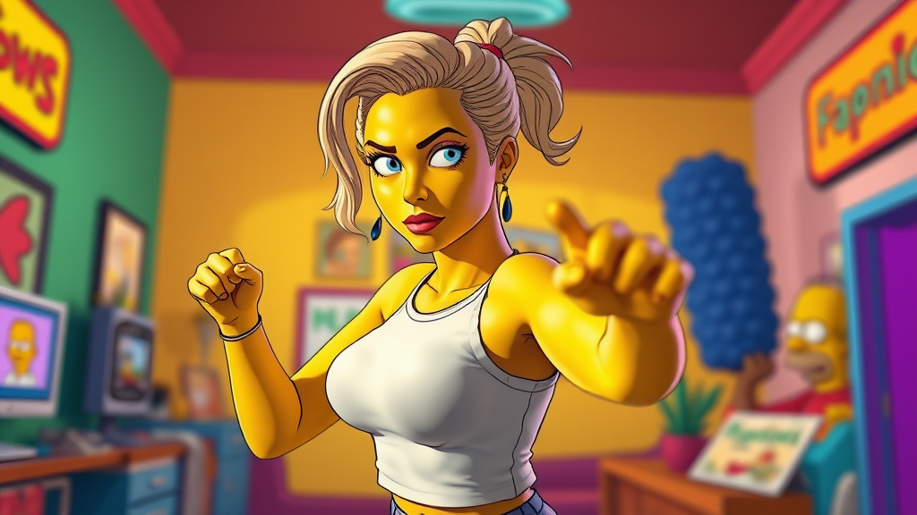 A highly detailed 4k still image of Margot Robbie reimagined in the style of The Simpsons by Matt Groening. She is shown in a dynamic full body action pose, set against a vibrant background that complements her character. The scene features cinematic rim lighting with light shading, creating an epic and colorful atmosphere. The image is color graded to enhance its vividness, capturing the iconic essence of The Simpsons in a unique and imaginative way, with an aspect ratio of 2:3.