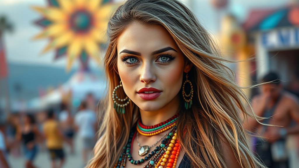 A highly detailed, 8k image of a confident woman with long flowing hair, expressive eyes, and full lips, gazing into the camera. She's adorned in vibrant festival attire, embodying the free-spirited essence of Coachella and Burning Man. Her look is a harmonious blend of bohemian and hippie influences, with colorful beads and eclectic accessories that capture the festival vibe, set against a backdrop of lively festival scenes.