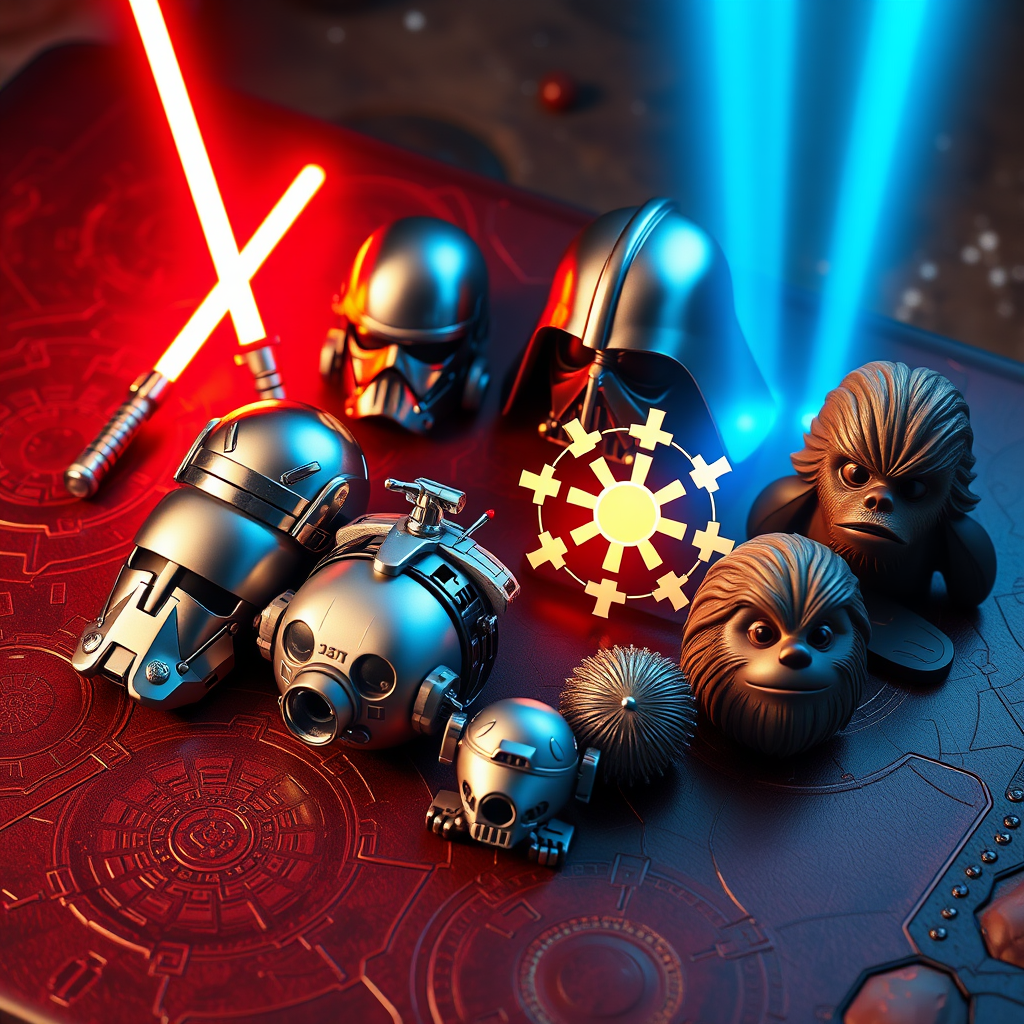 A highly detailed 8k octane render of a table layout featuring eight unique and realistic Star Wars-themed emojis. The table is arranged with intricate textures, capturing the essence of the Star Wars universe. Each emoji represents iconic elements: a lightsaber emitting a vibrant glow, a droid with polished metallic surfaces, a detailed Sith helmet with subtle reflections, a small spacecraft with minute detailing, a mystical Jedi symbol with radiant energy, an astromech droid with realistic weathering, a Wookiee with textured fur, and a holographic Star Wars emblem projecting a 3D effect. The scene is rich in color and immersive, set in a galaxy-inspired backdrop that enhances the depth and authenticity of each element.