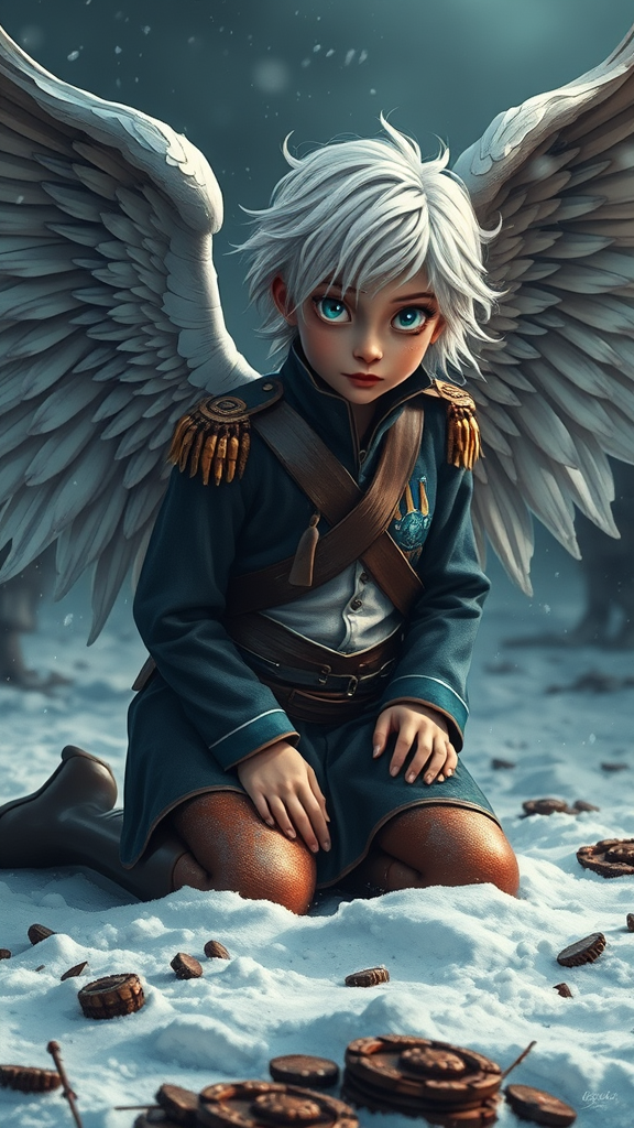 A highly detailed 8k pinup of the most defiant Napoleonic angel, blending historical drama with artistic flair, captured with a Fujifilm XT3 for a high-quality, film grain effect. The scene depicts a revolutionary French angel, kneeling on a battlefield amidst a blizzard, with muddy clothes and reflective eyes of the same color, highlighted by dramatic lighting and realistic skin tones. Blue Napoleonic war ornaments add to the intricate design, reminiscent of professional majestic impressionism oil paintings by artists like Waterhouse, John Constable, Ed Blinkey, Atey Ghailan, Jeremy Mann, Greg Manchess, and Antonio Moro. This piece is trending on ArtStation and CGSociety for its intricate, high-detail execution. The angel, with striking white hair, is adorned in a school uniform, set against a canvas framework that merges cartoon elements with an impressionistic touch. Avoiding any distortion or disfigurement, maintaining true proportions and an alluring presence.