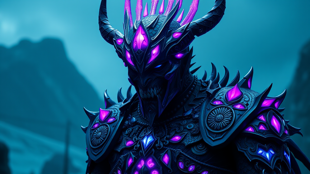 A highly detailed 8k ultra-realistic depiction of a menacing demon inspired by the Night King from Game of Thrones, envisioned by George R. R. Martin. The creature is clad in intricate, ornate armor with vibrant purple and blue neon accents that gleam under dramatic cinematic lighting. The armor features elaborate designs and textures, blending seamlessly with the demon's eerie presence. The focus is on hyperrealistic detail, capturing every nuance of this formidable being. The background is a haunting landscape that complements the demon's aura, rendered with the power of Unreal Engine 5. This evocative and chilling scene is crafted to be visually striking and intense, trending on art platforms like ArtStation, presented in 4k resolution, maintaining an immersive and cinematic atmosphere.