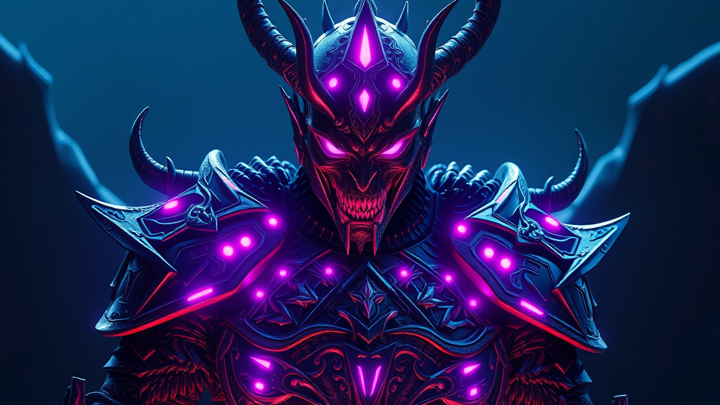 A highly detailed 8k ultra realistic depiction of a terrifying demon resembling the Night King from Game of Thrones, envisioned by George R. R. Martin. The full body is encased in intricate armor featuring glowing purple and blue neon highlights, with ornate patterns that evoke a sense of otherworldly power and mystery. Bathed in dramatic, cinematic lighting, this hyperrealistic portrayal captures every nuance with unreal engine 5 precision, showcasing high details that are trending on artstation. Set in a 4k resolution with a focused composition, the scene strikes a balance between fantasy and horror, drawing viewers into a breathtaking visual experience.