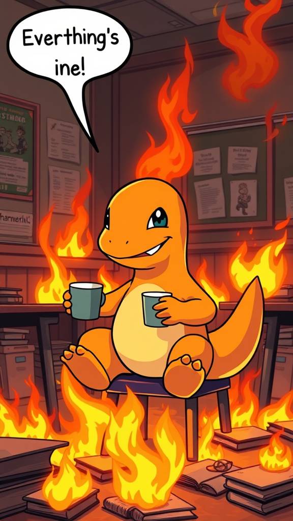A highly detailed and adorable Charmander is sitting in a classroom engulfed in flames, grinning mischievously as if proud of causing the fire. Charmander sits comfortably in one of the chairs, holding a tiny cup of coffee in one hand, looking completely unbothered by the chaos around him. The walls are lined with burning posters and textbooks scattered around. Above Charmander’s head, a cartoon speech bubble emerges, reading "Everything's fine." His fiery tail flickers playfully, adding to the scene of controlled chaos. The overall atmosphere highlights Charmander's playful nature amidst the blaze he enjoys, creating a humorous and whimsical twist on the classic meme.