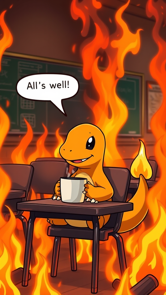 A highly detailed and adorable Charmander is sitting in a classroom engulfed in flames, smiling mischievously because he started the fire. Charmander sits calmly in one of the student chairs with a steaming cup of hot chocolate in front of him. Above his head, a cartoon speech bubble playfully reads, "All's well!" The scene captures the little fire-starter's delight in the chaos he caused, with little flames flickering on the tips of his tail adding to the warmth of the fiery classroom. The walls of the classroom are lined with charred chalkboards and singed posters, completing the whimsical scene.