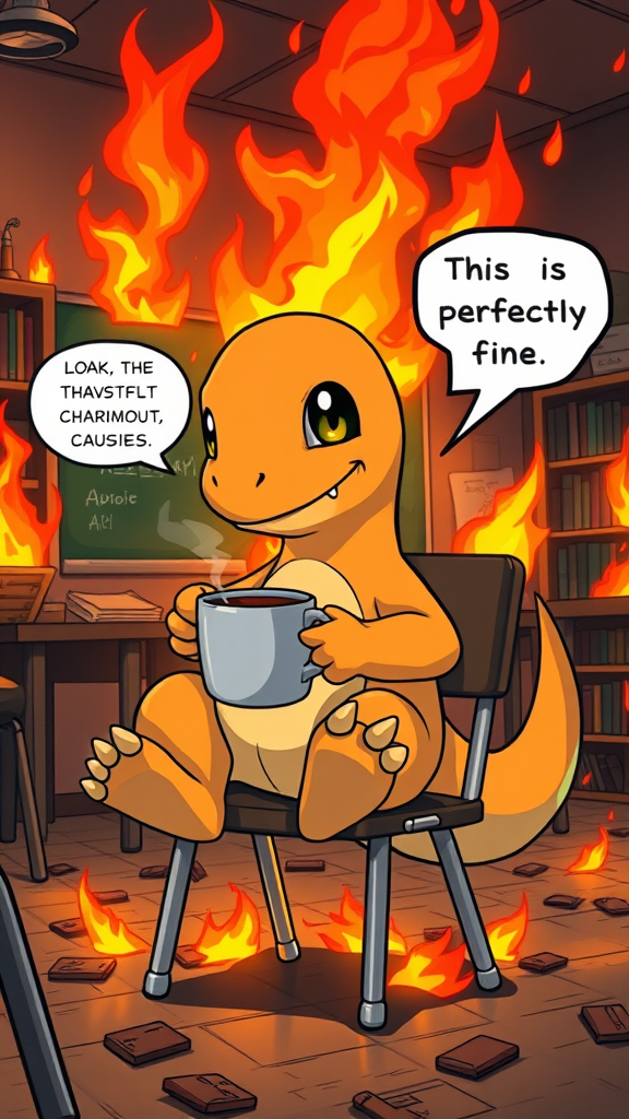 A highly detailed and adorable Charmander, with a mischievous grin, is seated comfortably on a small student chair in a classroom engulfed in flames. The lively blaze reflects in his bright eyes as he casually holds a steaming cup of coffee with his tiny claws. The room, lined with bookshelves and a chalkboard now scorched by the fire, crackles around him. With a look of pure contentment, he sits amidst the chaos he cheerfully caused. A comic-style speech bubble hovers near his mouth, reading, "This is perfectly fine," adding a playful twist to his fiery escapade.