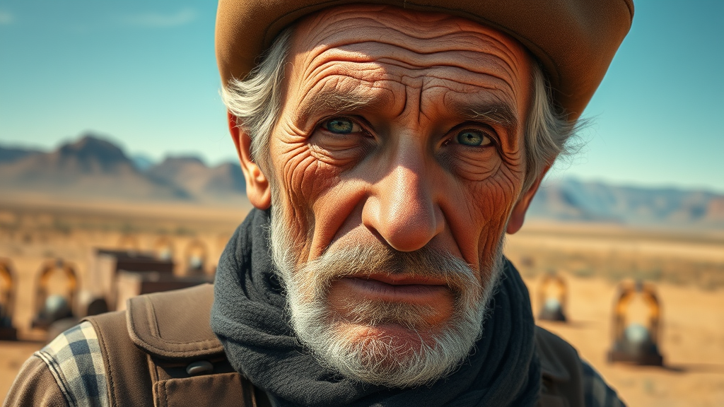 A highly detailed and beautifully painted portrait of an elderly coal miner from the 19th century, capturing the rugged spirit of the wild west. The miner's face tells a story of resilience, with deep-set wrinkles and eyes filled with wisdom and hard-earned experience. The background shows the vast, open landscapes typical of the era, with dusty plains and distant mountains under a clear blue sky. The painterly style is reminiscent of the works of Greg Rutkowski and Magali Villeneuve, emphasizing intricate details and texture. The scene is rendered with clarity and precision, as though an 8k high-resolution photograph, bringing every subtle detail to life.