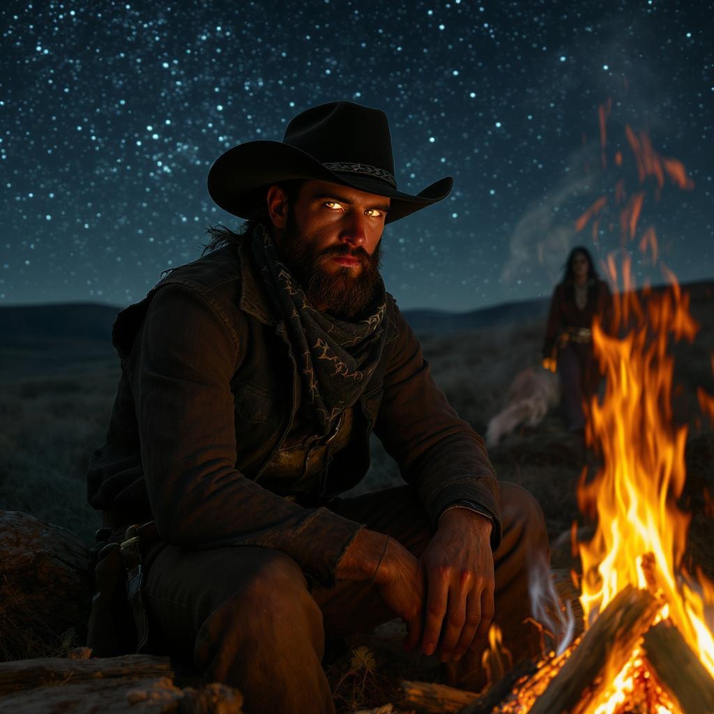 A highly detailed and breathtaking portrait of a 28-year-old cowboy sitting by a campfire on the prairie, capturing the essence of the Western frontier. The scene, shot in ultra-sharp focus, emphasizes the cowboy's rugged yet striking features under the vast, starry sky. His eyes reflect the flickering flames, adding depth and a cinematic quality to the visual. In the background, a mysterious figure of a borderlands woman can be seen, adding an air of intrigue to the composition. The setting is rich with textures: weathered leather, crackling wood, and the soft glow of the fire illuminating the cowboy's face. Retaining a sense of realism and authenticity, the image is devoid of any visual distractions, ensuring the focus remains on the captivating scene.