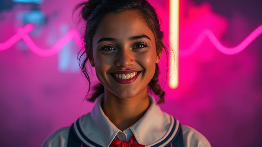 A highly detailed and breathtaking professional photograph of a character inspired by Anya Taylor-Joy, smiling warmly and wearing a chic preppy school girl uniform. Her skin is a radiant olive tone and her face features exquisite symmetry. The background is set with neon light smoke, creating a mesmerizing ambiance, while volumetric fog adds depth to the scene. The indirect lighting casts soft shadows, highlighting her features with stunning clarity. Captured in hyperrealism, this image is rendered in 8k UHD, emphasizing every intricate detail, from the texture of the fabric to the glimmer in her eyes.