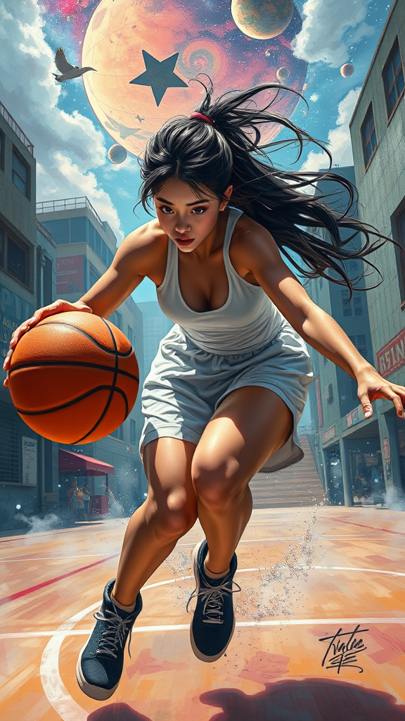 A highly detailed and captivating painting of a woman skillfully dribbling a basketball, featuring the artistic styles of Conrad Roset, Greg Rutkowski, and Makoto Shinkai. The scene captures the dynamic motion and intensity of the sport, with vibrant colors and intricate detailing. The background is a blend of urban and celestial elements, adding a dreamlike quality to the composition. The piece exudes a sense of energy and elegance, showcasing the woman's focused expression and graceful movements. The painting is trending on ArtStation, admired for its unique fusion of artistic influences and breathtaking visuals. Aspect ratio 2:3, style setting 750.