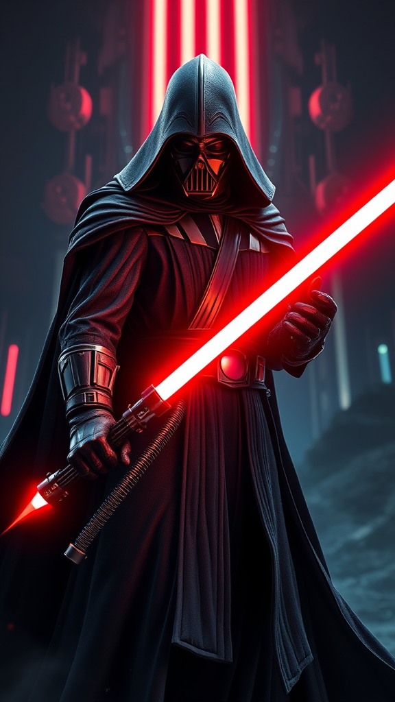 A highly detailed and cinematic poster of a Sith Lord from STAR WARS, showcasing the character in a dynamic full-body pose with intricate detailing and beautiful color grading. The scene is captured with a wide-angle lens, providing a sharp and stunning composition with depth of field effects. It features hyper-detailed elements and vibrant color coding, enhanced by natural incandescent and moody studio lighting. Backlit and accent lighting create a dramatic atmosphere, with volumetric effects and realistic shadows adding depth. Advanced global illumination techniques such as ray tracing and ambient occlusion bring a photorealistic quality to the image. The lighting is accentuated by optical fiber and glowing elements, creating a shimmering effect. Reflections and diffraction grading techniques, along with screen space reflections, add dimension and realism. The use of high-resolution textures and anti-aliasing ensures an ultra-detailed finish, while cell shading and tone mapping provide a painterly vibe. The concept art blends elegance with a hyper-maximalist approach, resulting in a stunning piece that captures the essence of the Sith Lord, devoid of any visual flaws like low quality or anatomical inaccuracies.