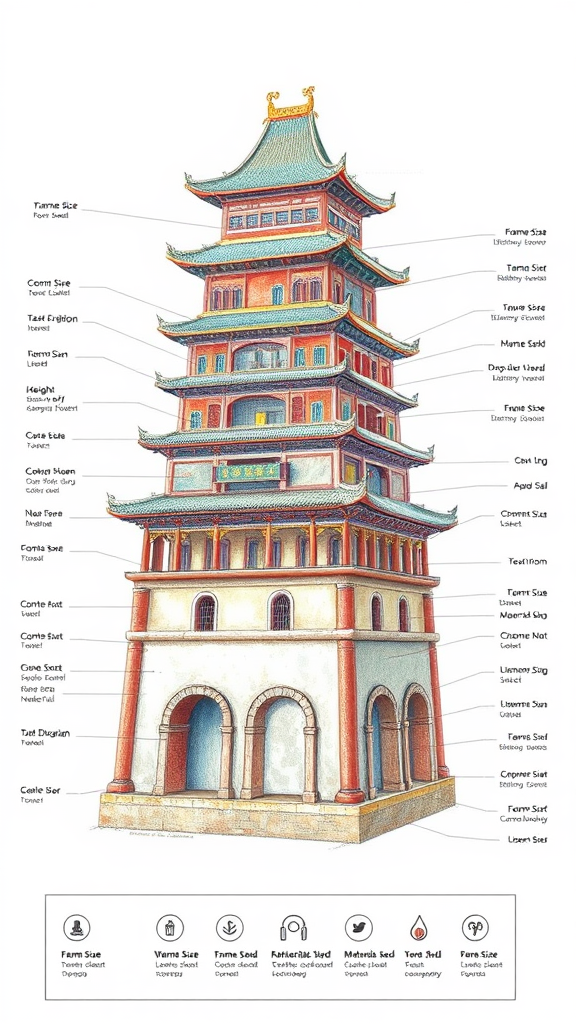 A highly detailed and colorful cross-section of an ancient Chinese tower, illustrated in a colored pencil style with realistic shadows, showcasing its construction techniques and design elements. Each level is labeled to highlight key features, such as rooms, bridges, architectural details, and historical elements. A text panel at the bottom provides insights into the tower's historical significance, including frame size, dimensions, height, weight, materials used, form structure type, construction technology, and user needs. The artwork includes related drip icons to emphasize important details. Set against a clean white background, the composition maintains a proportion ratio of 67:128, with minor creative modifications that complement the core concept.