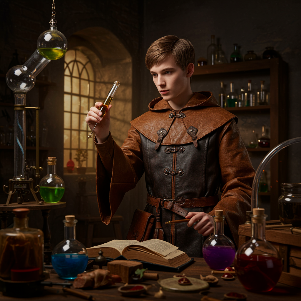 A highly detailed and hyper-realistic painting of a young male alchemist in a medieval lab, surrounded by potions and intricate apparatus. The setting evokes a dark fantasy atmosphere, with the alchemist wearing a richly adorned robe crafted from leather. The scene is vibrant, capturing the essence of alchemical mystery and historical intrigue, while avoiding any distortions or low-quality features. The background is subtly detailed to enhance the focus on the alchemist, ensuring clarity and precision in the depiction. The artwork embraces a sense of wonder and meticulous craftsmanship without falling into unrealistic or malformed representations, featuring a nuanced expression on the alchemist's face and well-proportioned anatomy.