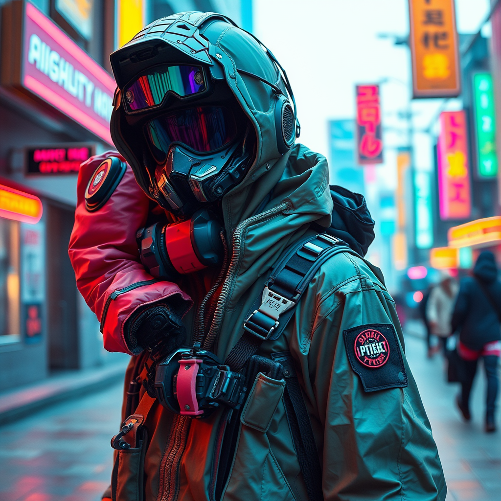 A highly detailed and intricate cyberpunk techwear streetwear ensemble is presented, showcasing a head-to-toe look that embodies luxury and elite status. The setting is a vibrant and futuristic cyberpunk world, where vibrant colors blend with hypermaximalist designs. This cinematic style is inspired by the works of Errolson Hugh and collaborations like Nike ACG, Yohji Yamamoto, Y3, and ACRNYM. Each item is thoughtfully designed to follow the divine proportions of the golden ratio, creating an aesthetically pleasing silhouette. With influences from matte painting, the attire exudes a sense of futurism and innovation, while maintaining the rugged practicality and avant-garde flair associated with techwear fashion.