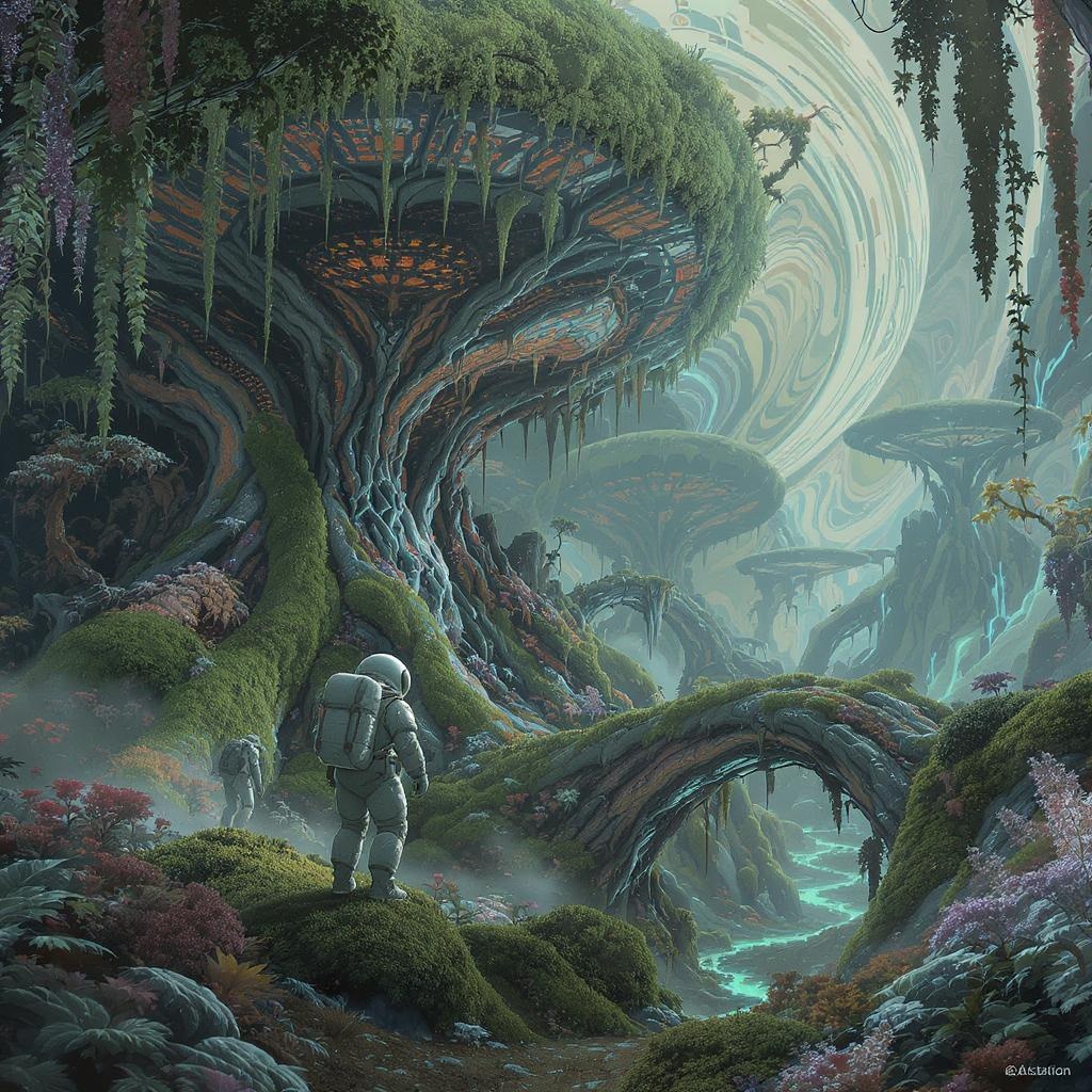 A highly detailed and intricate illustration of an astronaut exploring a lush, verdant alien world, showcasing a masterpiece of sci-fi atmosphere with vibrant plant life and strange, otherworldly landscapes in sharp focus. This artwork captures the essence of exploration and discovery in 4k resolution, with a sense of wonder and adventure, trending on artstation with embellishments and creative flair, adding subtle, imaginative twists to the classic concept.