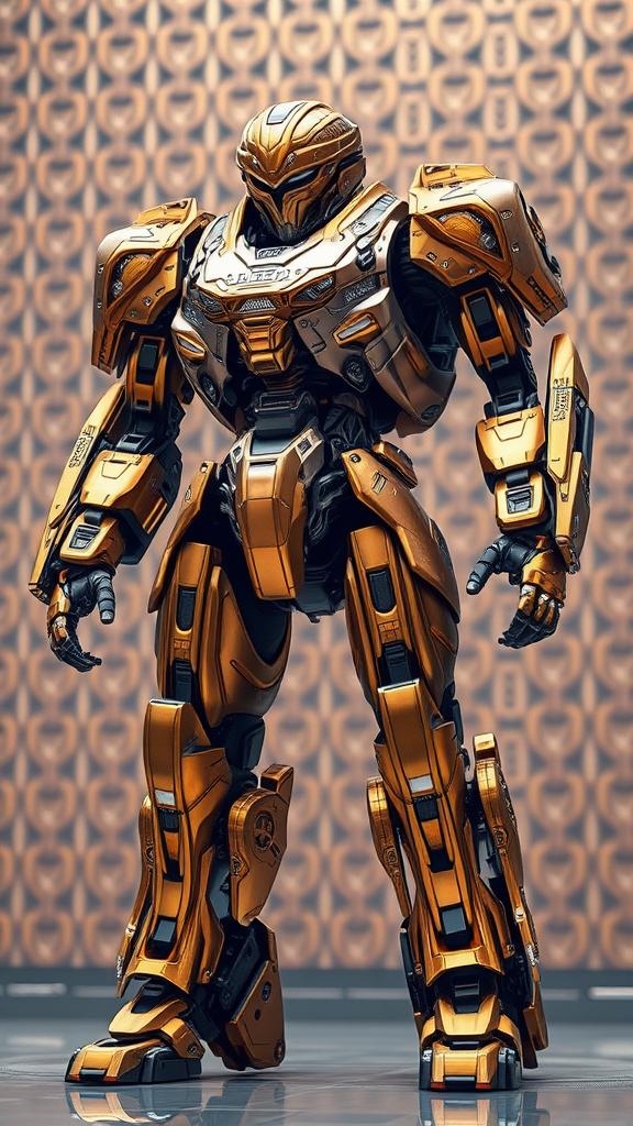A highly detailed and intricate scene featuring a futuristic combat robot, crafted with exquisite details and mastery. The robot, adorned in golden hues, stands tall with a cinematic composition that captures its full height. The scene is ultra-realistic, with cinematic lighting that highlights the robot's complex design and hyper-detailed structure. The ultra-wide-angle view adds depth to the scene, enhancing the beautifully color-coded and color-graded elements. The robot's anatomy is complex and multifaceted, showcasing its high-tech weapons and features. The background is beautifully designed, adding repetition and richness to the scene. While the robot's form is mostly coherent, subtle glitches in its design add character, like slightly distorted hands and a unique, abstract facial structure, hinting at future mutations and evolution. The composition remains balanced despite these creative imperfections, evoking a sense of awe and inspiration without crossing into the grotesque.