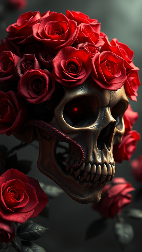 A highly detailed and intricate skull composed of vibrant red roses, blending elements of organic horror and devilish motifs. The composition is influenced by Giger's style, with an emphasis on death and rebirth. The visual style combines the elegance of Baroque and Art Nouveau, reminiscent of James Jean's work. Rendered in a photorealistic manner using 3ds Max and V-Ray, the piece achieves extremities in both contrast and sharp lines. The central composition draws from cinematic techniques, utilizing VFX and Unreal Engine 5 for atmospheric depth, while also incorporating the vivid colors and glow effects of anime and manga styles. This digital art piece is carefully hand-drawn and rendered in 8k using Octane Render, Cinema 4D, and Blender, achieving a dark, atmospheric tone. The imagery remains hyperrealistic with a wide depth of field, exuding a sense of epic majesty akin to professional oil paintings by Ed Blinkey, Atey Ghailan, and Jeremy Mann. The work is a masterpiece, trending on platforms like ArtStation and CGSociety, with inspirations from Studio Ghibli, Greg Manchess, and Antonio Moro, showcasing dramatic and intricate detail. The overall image is sharp in focus, encapsulating a dramatic and striking vision without incorporating elements of distortion or poor anatomy.