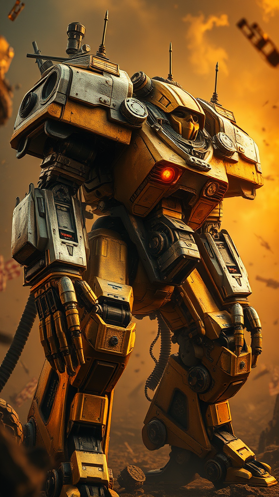 A highly detailed and masterfully crafted depiction of a powerful combat robot inspired by Warhammer 40,000, adorned in golden hues. The scene is rendered in epic realism with an HDR effect, capturing the intricate components and imposing stature of the nousr robot amidst a complex and dynamic background. Dramatic and warm lighting enhance the cinematic quality of the piece, with a hyper-detailed focus on the robot's armor, weaponry, and mechanical features. The atmosphere is one of grandeur and faded epicness, creating a sense of awe and intensity.