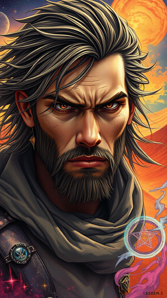 A highly detailed and mesmerizing painting featuring a rugged male character inspired by Dune, depicted with intricate features and a psychedelic flair. The portrait is centered and showcases influences from artists Conrad Roset, Greg Rutkowski, and Makoto Shinkai, combining their styles to create a realistic and cinematic look. The setting features vibrant colors and ethereal elements, reflecting the mystical essence of the desert landscape from Dune. The character's expression is intense yet enigmatic, with windswept hair and piercing eyes, capturing the essence of a visionary leader amidst swirling sands and celestial motifs. This artwork exudes a sense of otherworldly beauty and complexity, making it stand out in contemporary art spaces like ArtStation.